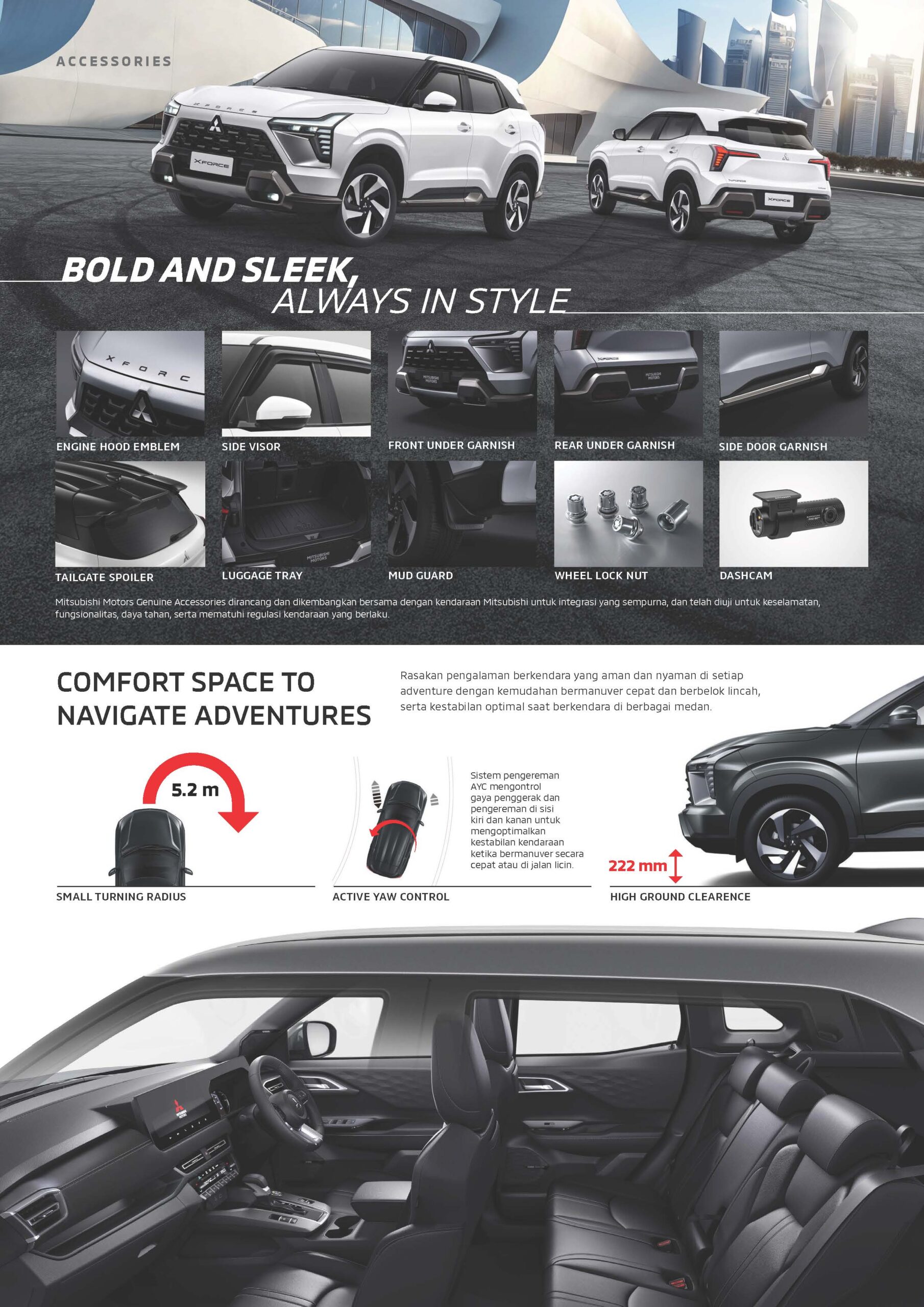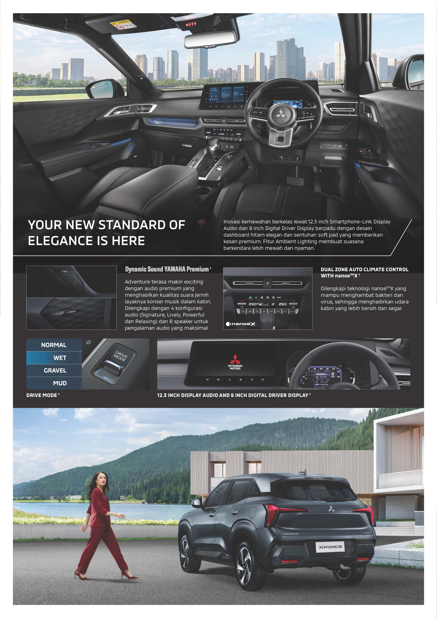 Tak hanya sampai disitu, Mitsubishi XFORCE juga dilengkapi fitur empat mode penggerak Normal, Wet, Gravel, dan Mud yang dapat dipilih sesuai dengan kondisi jalan yang sedang dilalui.